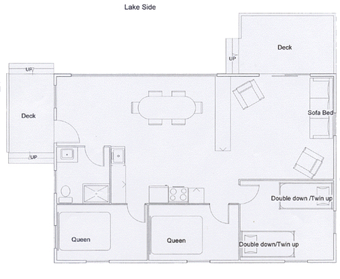 3 large bedrooms plus futon. Sliding glass door to large deck overlooking the lake. Large knotty pine living & dining area. AIR CONDITIONED (Beds; 3 queen & 2 twin) Capacity 8*