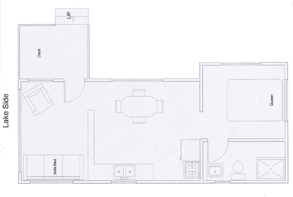 Cozy 1 bedroom plus futon. Wall of windows overlooking the lake, knotty pine interior and deck. AIR CONDTIONED (Bed; 1 queen) Capacity 2*